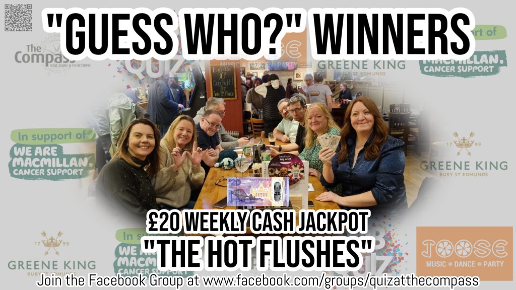 Newcomers “The Hot Flushes” had correctly guessed TV sports broadcasting legend Des Lynam as our mystery celebrity and were drawn out to win the £20. They very generously donated their winnings to Macmillan Cancer Support, so a HUGE thanks to them!